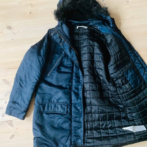 Kun brugt få gange, målt 85 cm fra skulderen. 2 udvendige skrå lommer. Nypris 2000,-.