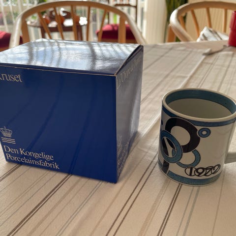 Royal Copenhagen Mønstret Krus med blå dekorative mønstre og kronemotiv. Kruset har hank og er fremstillet i porcelæn. Designet med tal og klassiske blå detaljer.