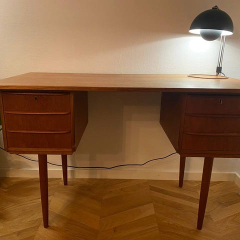 Dejligt skrivebord med 4 skuffer og skab. Hylde på bagsiden, men pladen mangler 'pinde' men der kan bare bruges dybler.