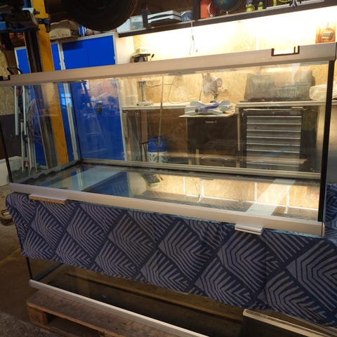 Flot velholdt move akvarie der er org akvastabil led lys med sunraise der er installeret flot indvendig klippebaggrund og der medfølger en eheim spandpumpe med ind og udgang i bunden af akvarier så der er ingen synlige slanger