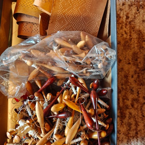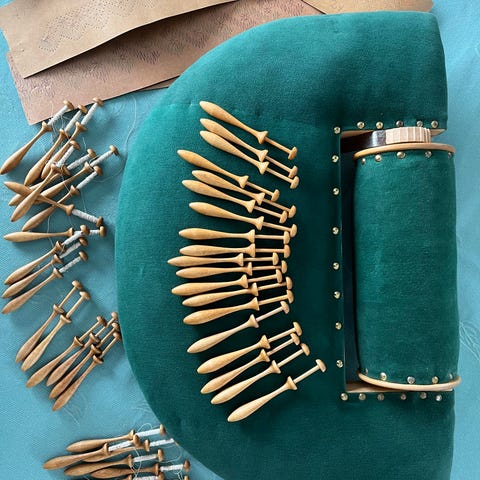 Kniplebræt incl valse og trætrisser. Transporttaske og opskrifter medfølger.