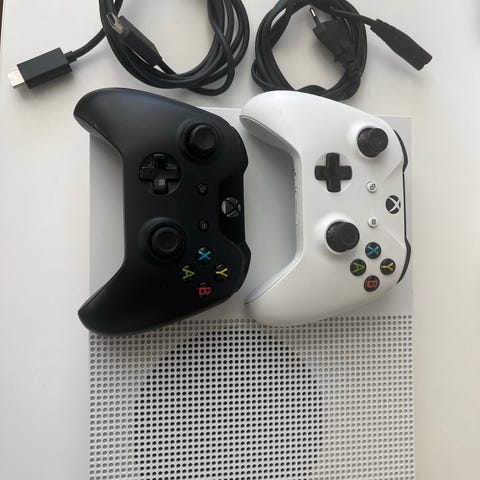 Microsoft Xbox spillekonsol med to controllere. Konsollen er sort og leveres med tilhørende kabler og to sorte controllere med farvede knapper.