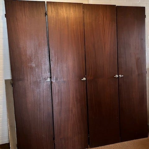 Vi piller en gammel 60’er skabsvæg ned. Lågerne er virkelig fine, men vi har ikke evnerne til at bygge et nyt skab til dem. Vi synes, det er synd at smide dem ud, så måske andre kan bruge dem.