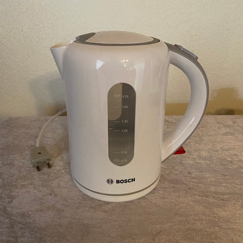 BOSCH elkedel fremstår i god stand, men med slidtage af skrift og en anelse kalk. Begge dele kan ses på billeder.