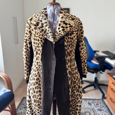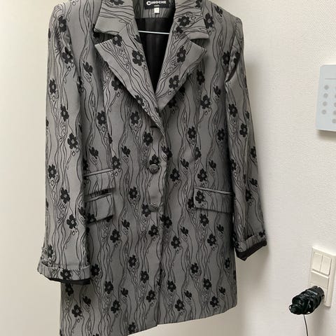 Sidder flot. Stoffet falder smukt. Sættet er lidt for stort til ginen og sidder derfor ikke helt optimalt. Flot stand. Ulden er som ny. Indvendig let skjold på for ved ærme , lille plet på for nederst på ryg , foret har været syet lidt ind og har spor efter syning. Se foto.