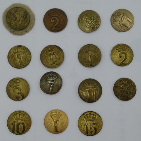 Lot med 19 hvide bataljonsmærker - knapper hvoraf de fleste er forskellige