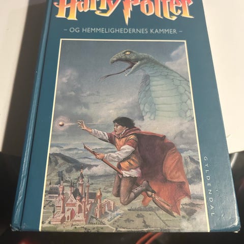 Harry Potter og Hemmelighedernes Kammer bog. Bogens omslag viser en illustration af Harry Potter i flyvende bevægelse med en tryllestav, samt et slot og en stor slange i baggrunden.