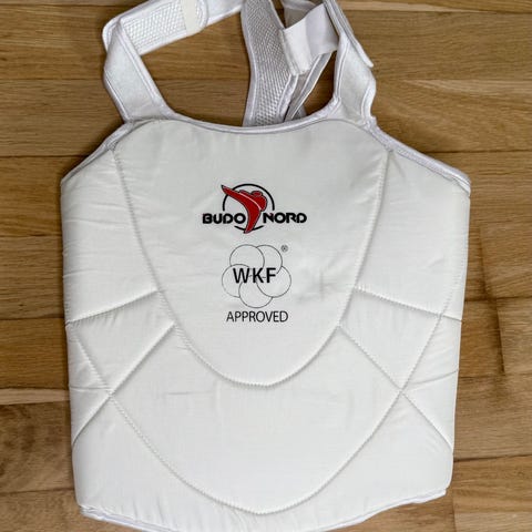 Budo-Nord kampvest, der er WKF godkendt, så den er perfekt til stævner. Den har et bredere design omkring brystet, idet vesten er justerbar foran ved skulderne.