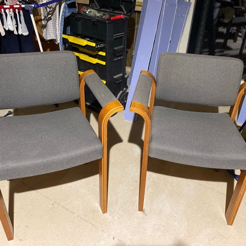 Sælger to flotte og komfortable stole med armlæn fra Magnus Olesen, dansk kvalitetsproducent kendt for solidt håndværk og tidløst design. Stolene er produceret i Danmark og har originalt mærkat.