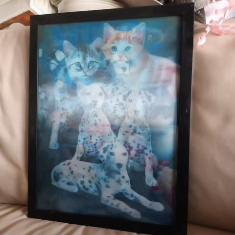 Sjovt billede af "glade" katte. Indrammet i metalramme med glas og måler 19 x 14 cm (incl. ramme).