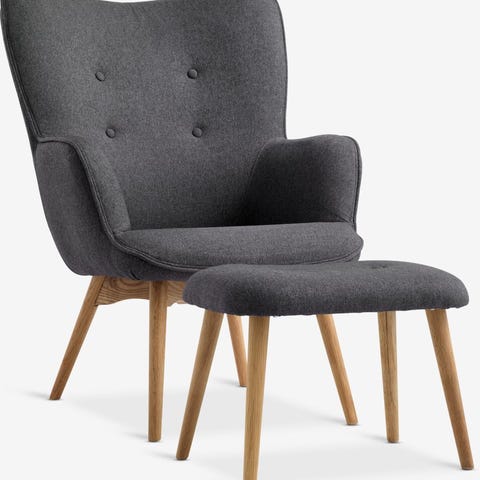 Skalborg Lænestol med fodskammel i mørkegråt stof og med ben i massiv eg.