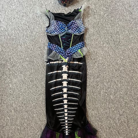Halloween Kvinde kjole med skeletmotiv i lilla og hvid samt blomsterdetaljer. Kjolen er sort med lange, gennemsigtige ærmer og et lag af tyndt stof over nederdelen. Medfølger en sort hat med glitrende edderkoppenet-mønster.
