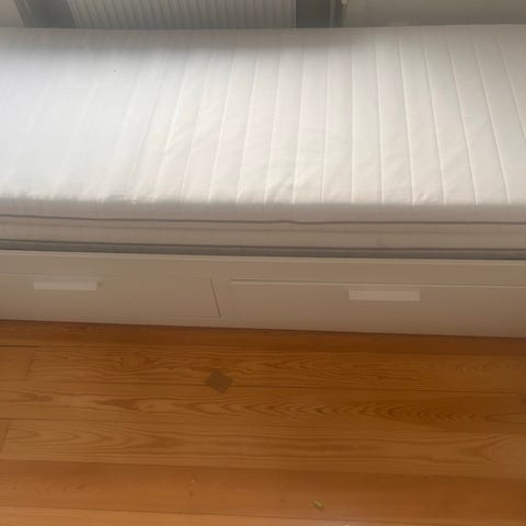 Rigtig fin hvid seng fra IKEA. Der medfølger to hvide skummadreasser der passer til sengen. Man kan se at den har været brugt, men alt fungere helt fint. To rummelige skuffer.