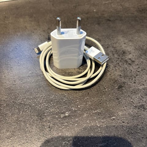 Apple oplader i hvid farve. Kompatibel med enheder, der understøtter USB-opladning.