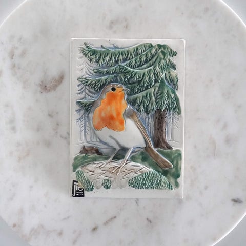 Fin keramik relief / vægplade / vægdekoration fra Jie Gantofta Sweden. Motivet forestiller en rødhals i skoven på hvid uglaseret baggrund. Der er lidt misfarvninger i den hvide glasur. Den mangler snoren - der kan nemt sættes en ny i. Der er et lille afslag i det ene hjørne på bagsiden. Størrelse: 15*10,5 cm.