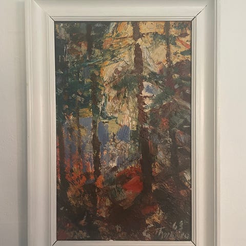 Parti fra Rold Skov malet af E. Thorbjørn. Købt af kunstneren i 1966. bredde 43, højde 52 inkl. ramme