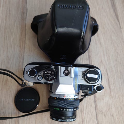 Olympus OM-1 spejlreflekskamera med tilhørende objektiver. Kameraet har en klassisk analog konstruktion og leveres med to forskellige objektiver, der giver mulighed for fleksibel fotografering. Kameraet er egnet til brugere, der ønsker at arbejde med filmfotografering. 3 kameraer sælges samlet