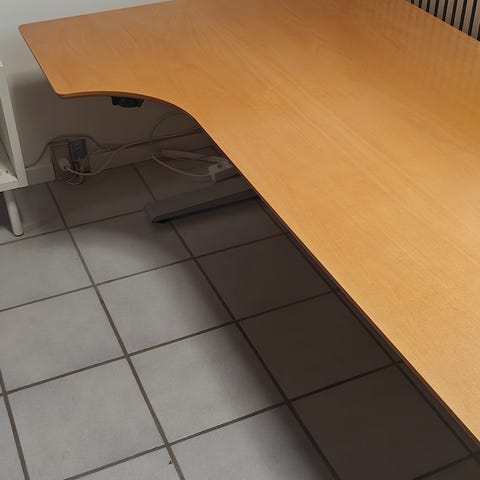 Stort skrivebord, 180 cm lang, 110 cm bred i venstre side og 90 cm bred i Højer side. Bordpladen er sort, med en skuffe og elektrisk hæve/sænke funktion.