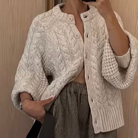 Lækker, blød strikcardigan i flot creme/hvid nuance med smukt struktureret mønster. Cardiganen har knaplukning foran og fine detaljer i strikken, som giver et eksklusivt og tidløst look.