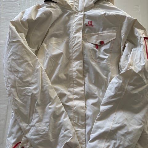 Salomon, Dame skijakke i pink farve. Jakken har hætte og lynlåslommer. Indvendigt foret med sort fleece og orange stof. Designet til kvinder.