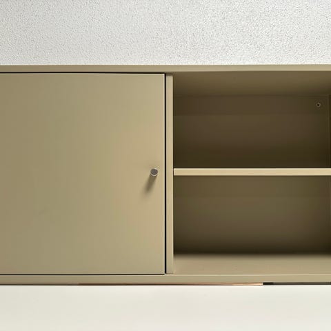 Benene kan fjernes, ift evt ophængning på væg. 3 hylder medfølger. Skabet har fået naturlig olie. Bagbeklædningen er ikke olieret.