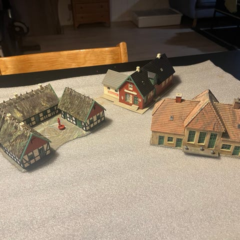 Flere huse i HO-størrelse. 1 købmand, 1 bondehus og 1 Den gamle kro. Lidt danske huse til togbanen. De er i rimelig stand.