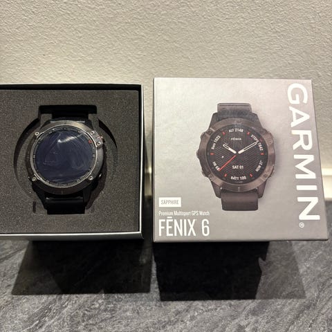 Garmin Fenix 6 Pro. Købt oktober 2020 (4.289 kr.). Virker upåklageligt. Brugsspor efter 5 års brug. Har været rigtig glad for uret. Rem skal nok skiftes.
