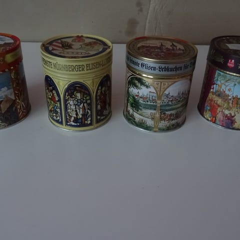 Fin samling af kønne kagedåser. De fleste er over 50 år gamle.