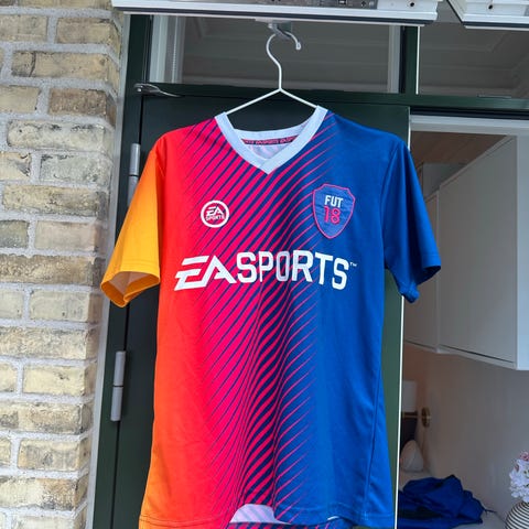 Icons EA herre T-shirt i størrelse M. Farverne er hvid og blå med gule detaljer. T-shirten har kortærmet design og er lavet af et let materiale. Der er et diagonalt mønster på fronten.