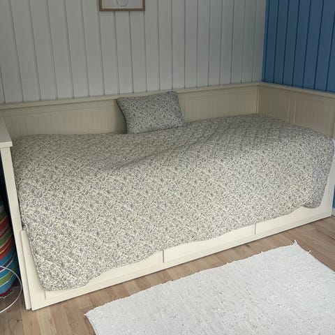 IKEA Hemnes seng med opbevaring i hvid farve. Sengen har tre skuffer under sovefladen, som kan bruges til opbevaring. Designet med ryglæn og armstøtter. Kan trækkes ud til en dobbeltseng 2x80 cm.