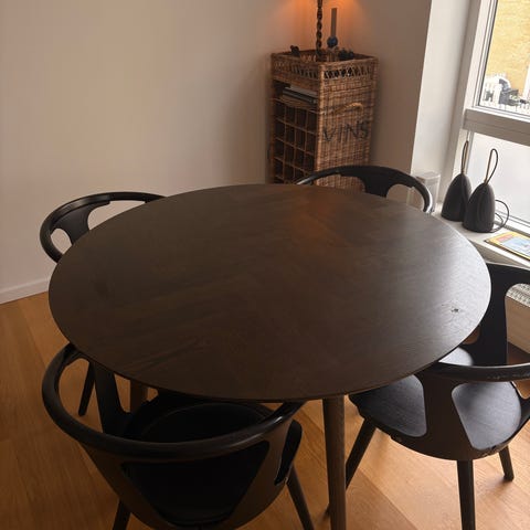 Rundt RICHMOND spisebord fra ILVA (120cm i diameter). Det har nogen mærker som vist på billedet. Der kan sidde mindst 4 personer. Det kan ikke forlænges med tillægsplade. Bordplade i olieret egefiner og ben i olieret massiv eg Dia 120 x H 75 cm. Kan afhentes på Vesterbro.