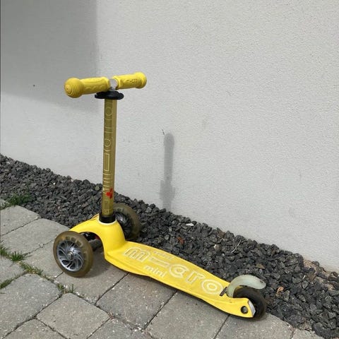 Micro løbehjul i blå farve med metalramme. Egnet til børn og voksne til transport og fritidsbrug.