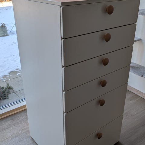 Kommode 6 skuffer, hvid/lyserød, 60x57x123 cm. Koster 1.560.- kr fra ny.