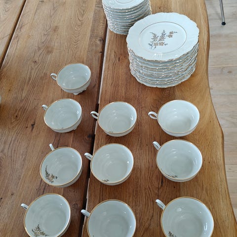 Bucka & Nissen porcelæn skål med låg, hvid med guldkant. Skålen er dekoreret og fremstillet i Tirschenreuth, Bayern, Danmark.