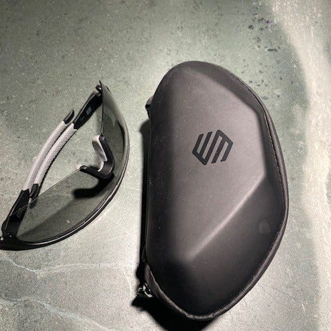 Siroko cykelbriller leveres med et hårdt beskyttelsesetui. Brillerne har mørke glas og en let, buet ramme. Brillerne er brugt få gange