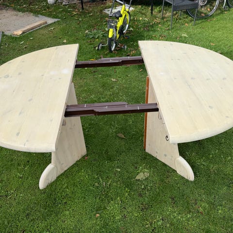 Gammelt massivt rundt Spisebord malet og i forgyldt træ. Design a Georg Kofoed Et herligt stort rundt spisebord dia 130 indskudplader 3 x 60 indskudsplader 75 h, hvor der kan sidde rigtigt mange ved 1600kr... 8 George Kofoed Spisebordstol ingen løse stole, betræk lidt smudsig 8 stk Spisebordstol 400kr.. Spisebord med stole 1800kr. Kan levere mod betaling