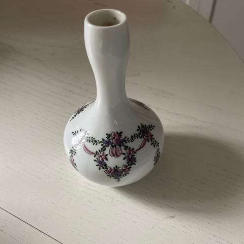 Hvid porcelænsvas med gråt og lyserødt blomsterprint. Corell Porcelain var en dansk porcelænsvirksomhed grundlagt af Leif John og Inge Corell i Aarhus i begyndelsen af 1970’erne og ophørte med driften i slutningen af 1980’erne. Virksomheden arbejdede primært med fade og porcelænsgenstande som askebægre, vaser og lignende produkter til virksomheder, foreninger osv. Bagsiden af vasen har et mærke - se det tredje foto, så den er sandsynligvis givet som en medarbejdergave. Diameter 7,3 cm - Højde 19 cm
