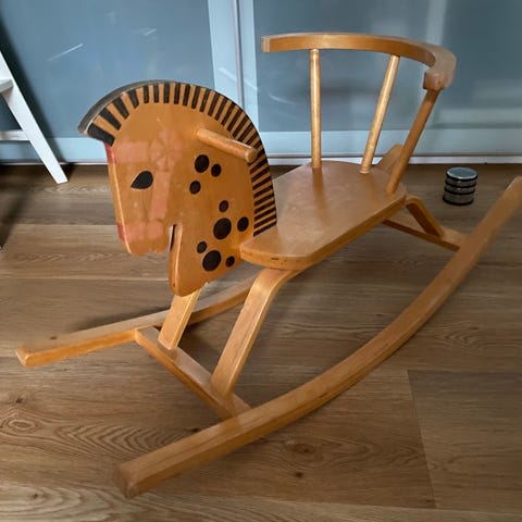 Charmerende gyngehest i træ med en skøn pjusket lilla manke.