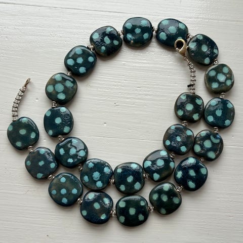 29 stk håndlavede keramik "perler" 2,5 x 2,5 cm - med prikker og ensfarvede - en lille glasperle som mellemrum mellem perlerne.