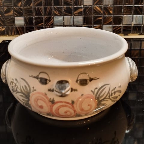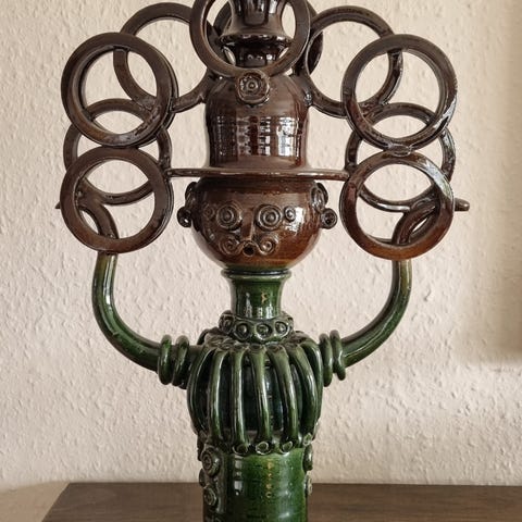 Bjørn Wiinblad påskeæg med stander. Ægget er nr 30 af 36 fra årets produktion i 1993. Ægget måler ca 15 x 12 cm og standen ca 18 x 13 cm. Samlet er den 26 cm høj. Den ene tak på standen har være knækket af, men er repareret pænt og ses kun på indersiden. Se de sidste 2 billeder. Jeg vil helst ikke sende, da det var grunden til den knækkede tak. Den kan afhentes i Horsens eller Risskov eller leveres i Jylland og på Fyn mod betaling til brændstof. Jeg bruger ikke Fiks og færdig.