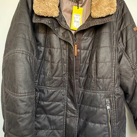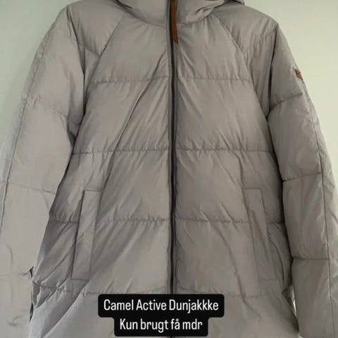 Camel Active dame frakkei beige farve, størrelse 40. Jakken er designet som udendørstøj med quiltet mønster og hætte. Materialet er genanvendt, hvilket fremgår af produktets mærkat.