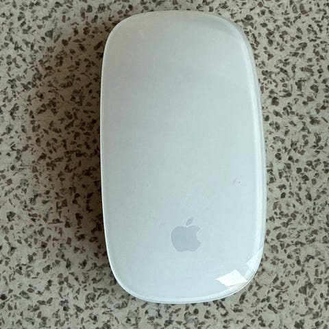 Apple Magic Mouse trådløs mus i sølvfarve. Musen er designet til brug med Apple-computere og har en glat overflade med multi-touch funktionalitet. Den drives af to AA-batterier, som indsættes i bunden af enheden.