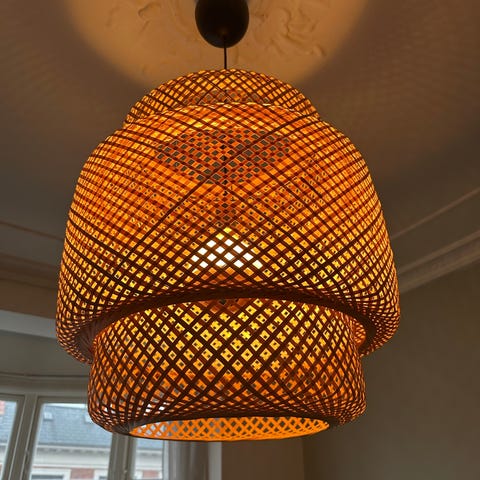 Sælger min flotte IKEA SINNERLIG pendel i håndflettet bambus (designer Ilse Crawford). Lampen er den store model (ca. Ø 50 cm, højde ca. 54 cm) og giver et varmt, dekorativt lys med fint skygge-spil. Den er brugt, men i god stand — ingen brud på fletværket. Ledning følger med (ca. 1–1,6 m). Pære er ikke inkluderet (anbefales E27 LED, klart/globe for hyggeligt lys).