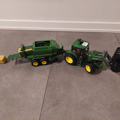 Bruder legetøjs traktor Lamborghini med frontlæsser og tvillingehjul. Sættet inkluderer en trailer med tippelad, en Fliegl gyllevogn og en Claas rundballepresser. Fra ikke-ryger og ikke-husdyr husholdning. Skriv besked hvis du kun er interesseret i dele af sættet. Kan også leveres i 9530 Støvring.