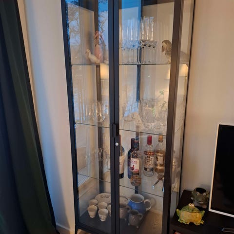 IKEA Milsbo vitrineskab. Har få brugsspor. Sælges uden nøgle, men den kan fåes i IKEA hvis det ønskes. Sælges pga flytning og sælges uden indhold.