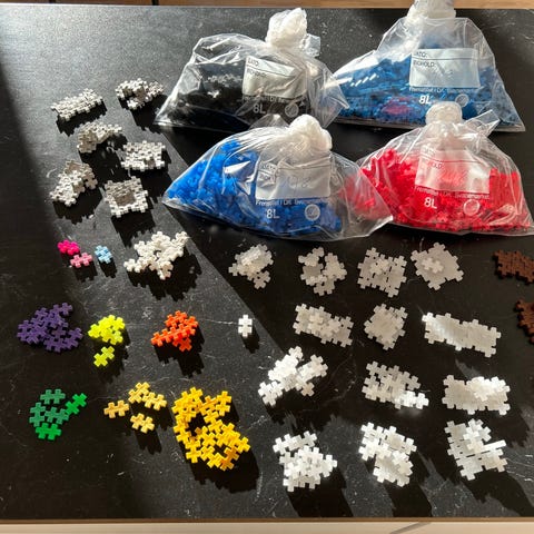 Plus Plus børn legetøj bestående af små, farverige byggeklodser i forskellige former og farver. Velegnet til kreativ leg og konstruktion.
