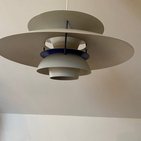 Louis Poulsen PH 5 lampe designet af Poul Henningsen. Lampen har et karakteristisk lagdelt design, der bidrager til jævn lysfordeling.