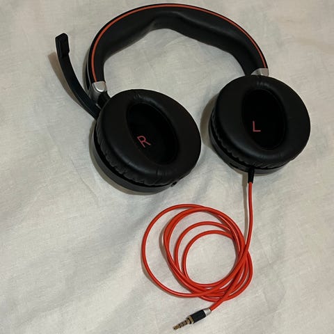 Jabra Evolve 80 hovedtelefoner med aktiv støjreduktion (ANC). Over-ear design med polstrede ørepuder og justerbar hovedbøjle. Udstyret med en ekstern kontrolenhed til styring af lydniveau og opkald. Velegnet til brug i kontormiljøer og til opkald, hvor støjreduktion er ønsket.