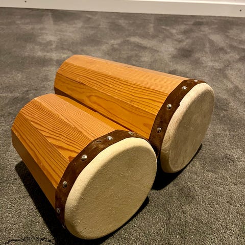 George Hennesy Bongo trommer i træ. Sættet består af to trommer med træskaller og metalbeslag. Trommerne er designet til musikbrug og kan anvendes til rytmeinstrumenter i forskellige musikgenrer.