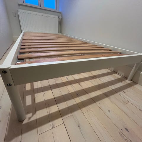 IKEA sengestel i metal med dekorative detaljer. Sengestellets farve er hvid, og det har en robust konstruktion. Egnet til brug som ramme til en enkeltseng eller dobbeltseng afhængig af størrelse.